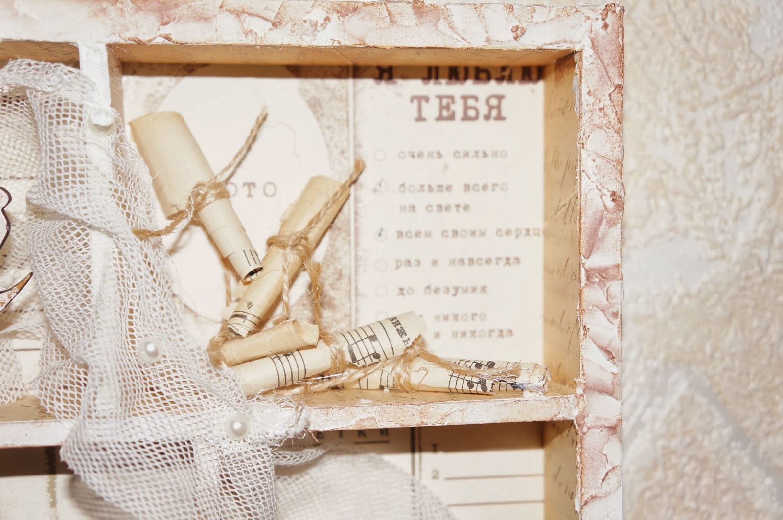 ОтветитьУдалитьЗамысел изначально был -сделать бокс в ретро стиле и фото напечатать в сепии, но..потом я увидела эту Викину бумажку и все..и плюс кружево и все ушло в другую тему))) Бокс собирали из заготовок...что понравилось ОБЪЕМ..все совсем по другому смотрится..воздушное и в полете..